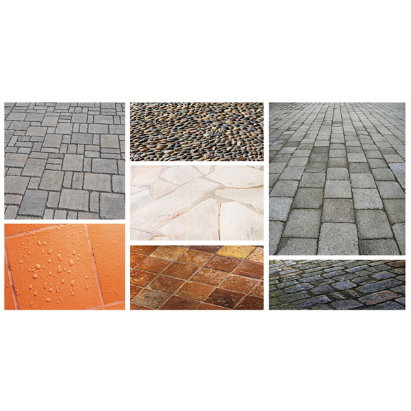 - Dallages et sols extérieurs : pavés autobloquants, pierres naturelles ou reconstituées, bétons bruts ou teintés, terres cuites, tomettes, etc…