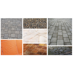 - Dallages et sols extérieurs : pavés autobloquants, pierres naturelles ou reconstituées, bétons bruts ou teintés, terres cuites, tomettes, etc …